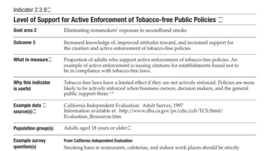The U.S. CDC has published a guide including 120 key outcome indicators that can be used to evaluate tobacco control programs. The guide includes prevention of youth initiation, limiting exposure to second-hand smoke, and promoting cessation among smokers.