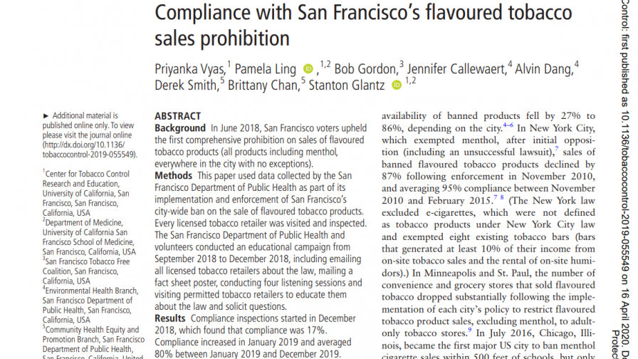 This research assesses compliance with San Francisco's 2018 flavored tobacco sales ban and concludes that retailer education prior to enforcement will result in higher compliance rates.