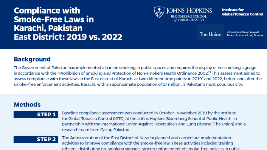 | The Government of Pakistan has implemented a ban on smoking in public spaces and requires the display of no-smoking signage in accordance with the “Prohibition of Smoking and Protection of Non-smokers Health Ordinance 2002.”1 This assessment aimed to assess compliance with these laws in the East district of Karachi at two different time points: in 20192 and 2022, before and after the smoke-free enforcement activities. Karachi, with an approximate population of 17 million, is Pakistan’s most populous city. |