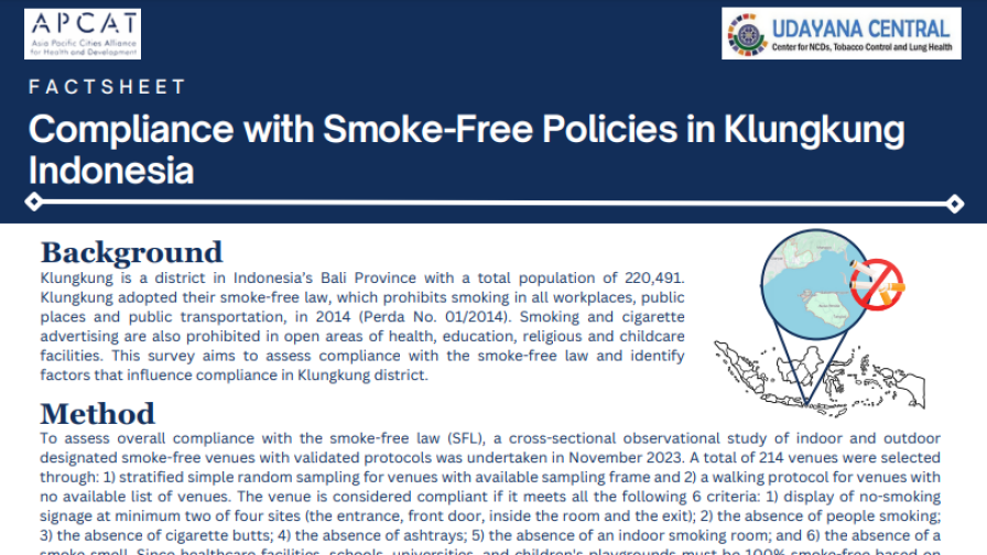 Klungkung has implemented a ban on smoking in public spaces and a ban on advertising in open areas of health, education, and religious and childcare facilities. This survey aimed to assess the level of compliance with the city's smoke-free and TAPS regulations in 2023.