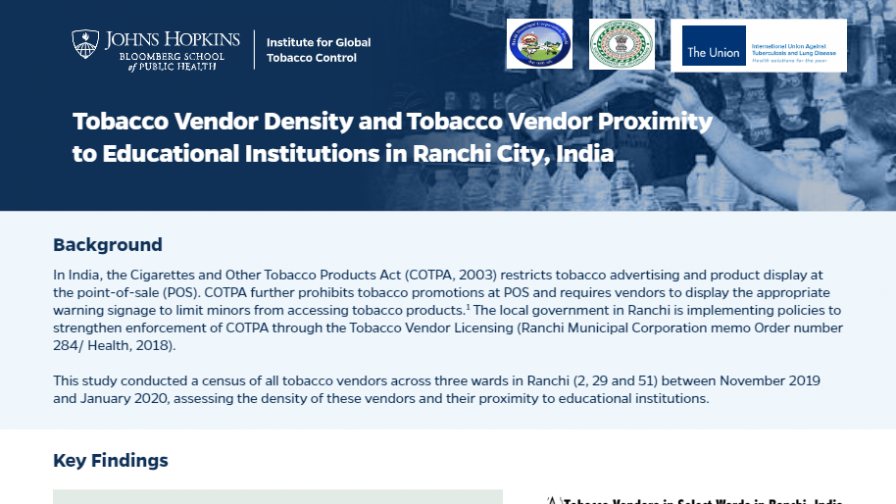 In India, the Cigarettes and Other Tobacco Products Act (COTPA, 2003) restricts tobacco advertising and product display at the point-of-sale (POS). The local government in Ranchi is implementing policies to strengthen enforcement of COTPA through the Tobacco Vendor Licensing. This study conducted a census of all tobacco vendors across three wards in Ranchi between November 2019 and January 2020, assessing the density of these vendors and their proximity to educational institutions.