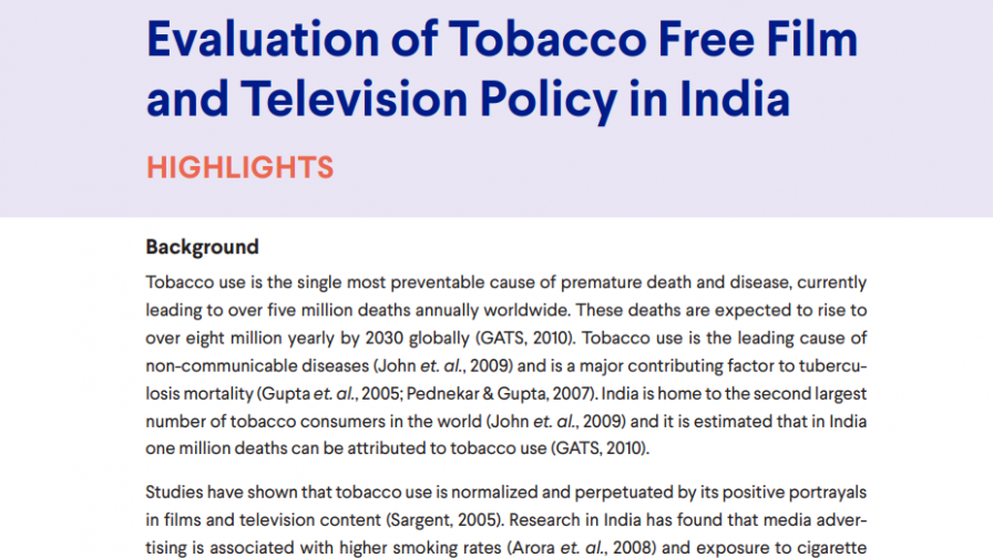 This study was conducted to gauge the extent of implementation of the tobacco free film rule in India, to identify patterns in compliance and violations, and to identify opportunities for strengthening the rule. Conducted in two parts, the first focusing on implementation of the rule of films in theaters, including exit interviews with randomly selected subset of film-goers to assess their reactions to the Film Rule. The second part comprised systematic observation of pre-recorded TV programmes to assess the Film Rule implementation in TV.